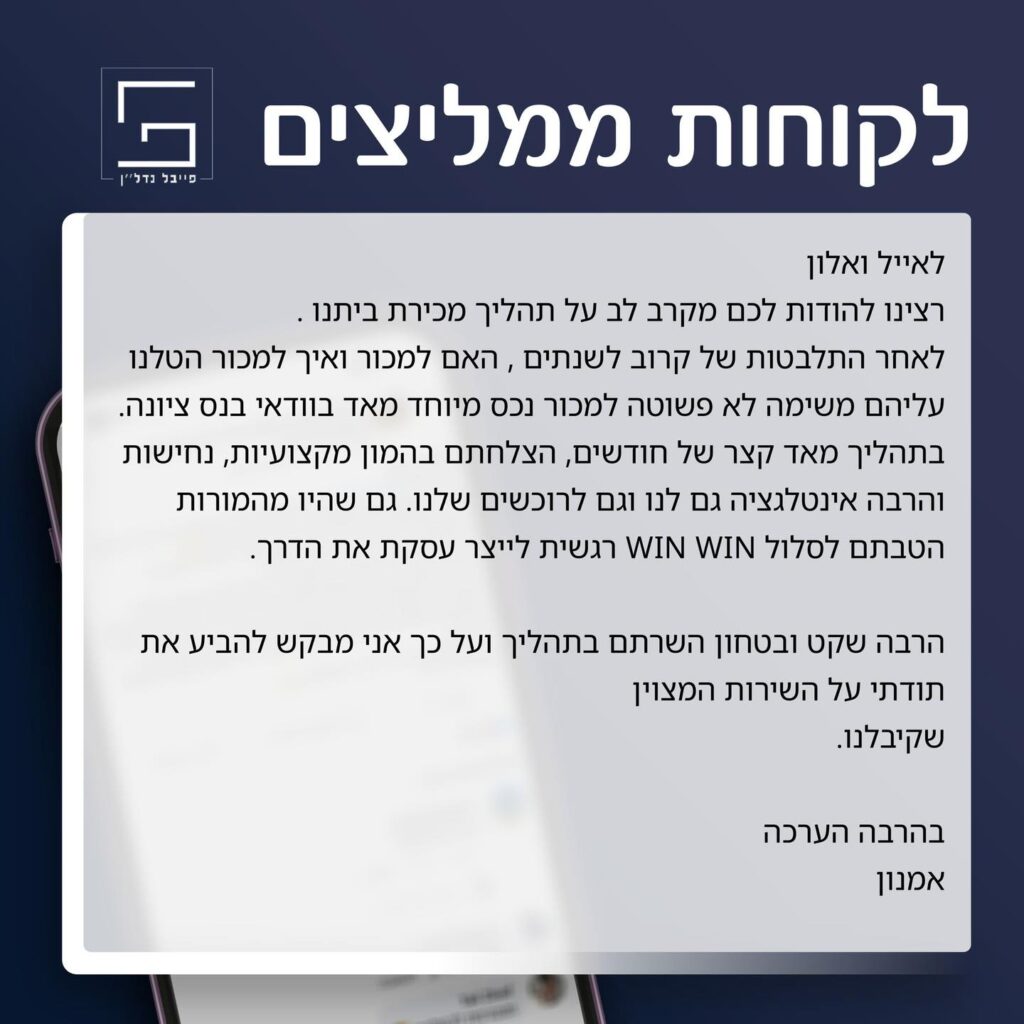 צוות המשרד מלווה את הלקוחות משלב הייעוץ הראשוני ועד לסגירת העסקה, תוך מתן דגש על שירות אמין, מקצועי ושקיפות מלאה. כל לקוח זוכה ליחס אישי והכוונה מדויקת בהתאם לצרכים הייחודיים שלו – בין אם מדובר במשפחות המחפשות את בית חלומותיהן, משקיעים המעוניינים בהזדמנויות נדל"ן, או עסקים הזקוקים לנכס מסחרי מתאים.