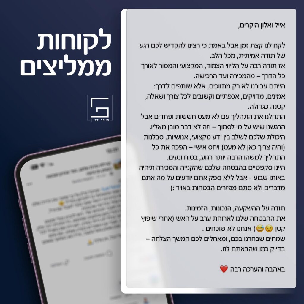פייבל נדל"ן שם לעצמו למטרה ליצור חווית תיווך אחרת – כזו שמבוססת על אמון, זמינות ומקצועיות, עם מענה מקיף לשאלות ולצרכים העולים בדרך. המשרד מעניק מעטפת שירות מלאה הכוללת הערכת שווי נכס, שיווק איכותי, חשיפה במדיות שונות וליווי משפטי וכלכלי לפי הצורך.
